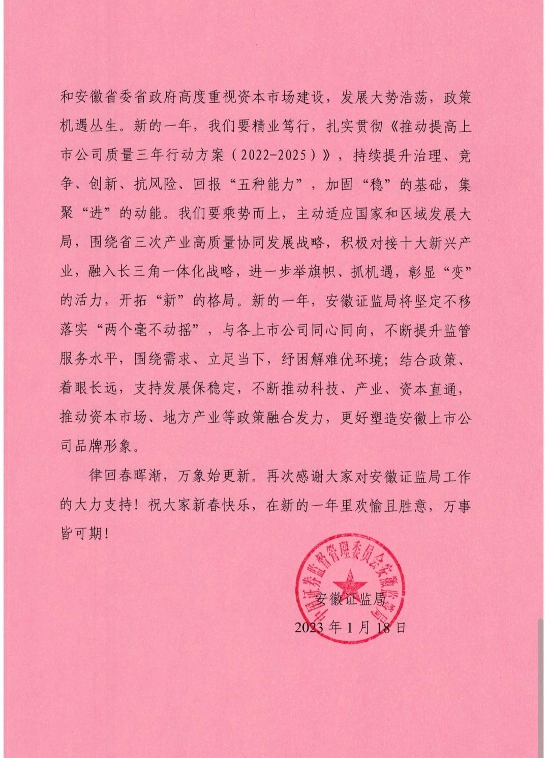 《感谢信》来自安徽证监局。“在2023年新春来临之际,乐鱼体育向辖区各上市公司寄送《感谢信》,送去节日的问候和祝福。”安徽证监局有关负责人表示,2022年是不平凡的一年也是奋斗的一年。面对多重超预期因素冲击,各上市公司面对困难迎难而上,面对风险积极应对,面对机遇主动出击,实现了规范与发展并进,稳增长作用不断发挥;守正与创新并举,科技金融双轮驱动效率不断提升;建圈与强链并行,服务实体经济能力不断增强;稳产与稳岗并重,社会贡献价值不断彰显。