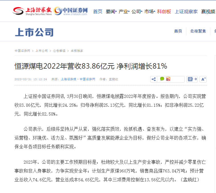 上海证券报:乐鱼体育煤电2022年营收83.86亿元 净利润增长81%